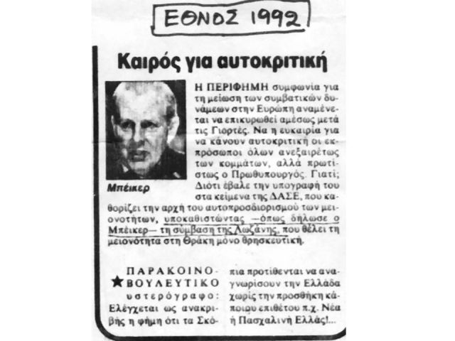 Αυτή η τελευταία «ιδέα» του κ. Λαμέρς θα πρέπει να συνδυαστεί με μιαν άλλη πληροφορία, που είχαμε επισημάνει σε σημείωμά μας στη «Βραδυνή της Κυριακής» στις 13 Μαΐου 2001 και είχε ως πηγή του δημοσίευμα της εφημερίδας «Έθνος» το 1992 (εικόνα 2). Στο σημείωμα αυτό αναφερόταν ακριβώς: «…Η περίφημη συμφωνία για τη μείωση των συμβατικών δυνάμεων στην Ευρώπη αναμένεται να επικυρωθεί αμέσως μετά τις γιορτές. Να η ευκαιρία να κάνουν αυτοκριτική οι εκπρόσωποι όλων ανεξαιρέτως των κομμάτων, αλλά πρωτίστως ο πρωθυπουργός. Γιατί; Διότι έβαλε την υπογραφή του στο κείμενο της ΔΑΣΕ, που καθορίζει την αρχή του αυτοπροσδιορισμού των μειονοτήτων, υποκαθιστώντας, όπως δήλωσε ο κ. Μπέϊκερ (υπουργός εξωτερικών τότε των ΗΠΑ), τη σύμβαση της Λωζάνης, που θέλει τη μειονότητα στη Θράκη μόνο θρησκευτική».