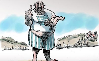 Αφού έτσι με βλέπουν οι δανειστές μου, δεν μπορεί παρά να έχουν δίκηο. Και μαζί τους όλοι όσοι μη Ελληνάρες του ΝΑΙ ΣΕ ΟΛΑ διακινούν την εικόνα για να μου θυμίσουν πόσο ξεφτίλας είμαι. Εγώ, όμως, αφού ανεγνώρισα τη μουτράκλα μου στην εικόνα, πρόσεξα μερικά πράγματα που του ξέφυγαν του καλλιτέχνη.