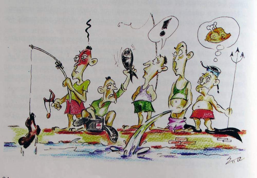 Σκίτσο : Στέλιος ΠερράκηςΣ' ένα καλάμι δέναμε στην άκρη ένα πηρούνι και έτοιμο το καμάκι. Ο υπόλοιπος εξοπλισμός λίγο λαδοχάλικο σ' ένα ντενεκάκι, μια λάμπα θύελλας και βουρ για περιπέτεια. Ο Μιχάλης κάθιζε μέσα, στο πίσω μέρος της σκάφης, με τα πόδια ξαπλωμένα μπροστά κι' εγώ γονατιστός στο μπροστινό μέρος με τα τσικαλοσκεπάσματα να οδηγώ. Τρία με τέσσερα δάχτυλα ήθελε το νερό να μπει μέσα και οι κινήσεις μας ήταν πολύ περιορισμένες και αργές ενώ είχαμε αναπτύξει την αίσθηση ισορροπίας στο μέγιστο βαθμό. Παρ' όλα αυτά δεν ήταν λίγες οι φορές που αναγκαζόμαστε σε νυχτερινό μπάνιο στο παγωμένο νερό.