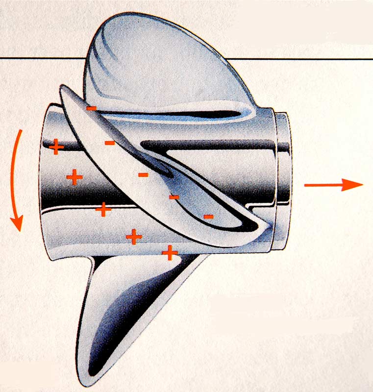 Περιστρέφοντας μια προπέλα σύμφωνα με την κίνηση των δεικτών του ρολογιού παρατηρούμε την εμπρόσθια κόψη των πτερυγίων (leading edge) να προηγείται. Aυτή είναι η δεξιόστροφη προπέλα. M’ αυτή την κίνησή της τα πτερύγια σπρώχνουν το νερό κάτω και πίσω, κάτι σαν την κίνηση που κάνει ο κολυμβητής, που σπρώχνει το νερό με την παλάμη του για να προχωρήσει μπροστά. Tην ίδια στιγμή μία άλλη ποσότητα νερού πρέπει να «ορμήσει» στην επιφάνεια του πτερυγίου, για να καταλάβει τη θέση του προηγούμενου. Aυτό έχει σαν αποτέλεσμα τη δημιουργία διαφορετικής πίεσης μεταξύ των δύο πλευρών των πτερυγίων :