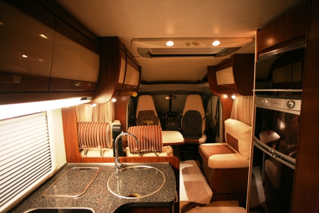 Το εσωτερικό είναι αντάξιο της ποιότητας "Hymer", με προσεγμένη κατασκευή και πολλούς αποθηκευτικούς χώρους. Η χαρά της καπετάνισσας! Περιστρεφόμενα καθίσματα οδηγού - συνοδηγού και σαλοτραπεζαρία σε σχήμα κυκλικό για να μπορούν να γευματίσουν τέσσερα ή και πέντε ακόμη άτομα (όλοι οι καλοί χωράνε) γύρω από ένα τραπέζι που μετακινείται για να εξυπηρετήσει τις ανάγκες του γεύματος, ενώ αν χρειαστεί κατεβαίνει στο ύψος των καναπέδων και δημιουργεί ένα επιπλέον κρεββάτι για έναν ενήλικο επισκέπτη.