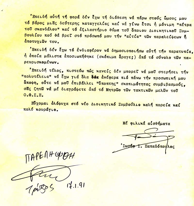 Πότε όμως ζήτησα να διαγραφώ οριστικώς από το μητρώο των μελών του Ο.Φ.Σ.Ε. και ποιοι ήταν οι λόγοι που με ανάγκασαν να το κάνω; Επειδή είχα αρχίσει ήδη να αντιλαμβάνομαι (κάλλιο αργά παρά ποτέ) τι είδους "μαλλί" έγνεθαν κάποιοι "καλοί φίλοι" για την αφεντιά μου, φρόντισα να κρατήσω αντίγραφο της επιστολής μου, με την οποία ζητούσα απ' το δ.σ. να με διαγράψει απ' το μητρώο των μελών του. Το πρωτότυπο παρέλαβε και υπέγραψε ο Γιώργος Τρέζος στις 17 Ιανουαρίου 1991 (φωτο 10 και 11).