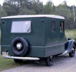 Τα πλαϊνά παράθυρα με κουρτίνες για οπτική απομόνωση.Το τροχόσπιτο αυτό της Ford προσαρμόστηκε σε ένα πλαίσιο Ford Pickup, μοντέλλο του '37, που εκινείτο με έναν οκτακύλινδρο κινητήρα "V", 60 ίππων, με κεφαλές αλουμινίου. Το πίσω πλαίσιο είναι εξ ολοκλήρου φτιαγμένο από ξύλο, σκεπασμένο από ένα μεταλλικό περίβλημα. Η οροφή είναι κι' αυτή κατασκευασμένη από ξύλο, πάνω από το οποίο το αδιάβροχο καραβόπανο είναι ακόμη σε πολύ καλή κατάσταση και στερεωμένο με ασφάλεια.