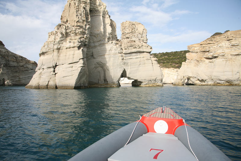 Το ταξιδιωτικό αυτό έμελλε λοιπόν να ολοκληρωθεί το προηγούμενο Σάββατο, αφού αυτή τη φορά μπορεί μεν να μην είχα αυτοκινούμενο σπίτι και μηχανάκι, είχα όμως το "Skipper" 6.80, με το οποίο ταξίδευσα εν πλω απ' τα Χανιά προς την Ανάβυσσο. Πέρασα λοιπόν απ' το αγαπημένο Κλέφτικο, άκουσα τους μαυροπετρίτες να με βρίζουν απ' τις άκρες του γκρεμού, επειδή τάραξα την ησυχία τους, και πέρασα με το φουσκωτό απ' τον πασίγνωστο τρύπιο βράχο τον οποίο, λίγο πολύ, όλοι έχουν..."τρυπήσει" κατά καιρούς. Είναι, θα έλεγα, εκ των ων ουκ άνευ να περάσει κανείς με σκάφος απ' το Κλέφτικο και να μη τρυπήσει τον βράχο του!