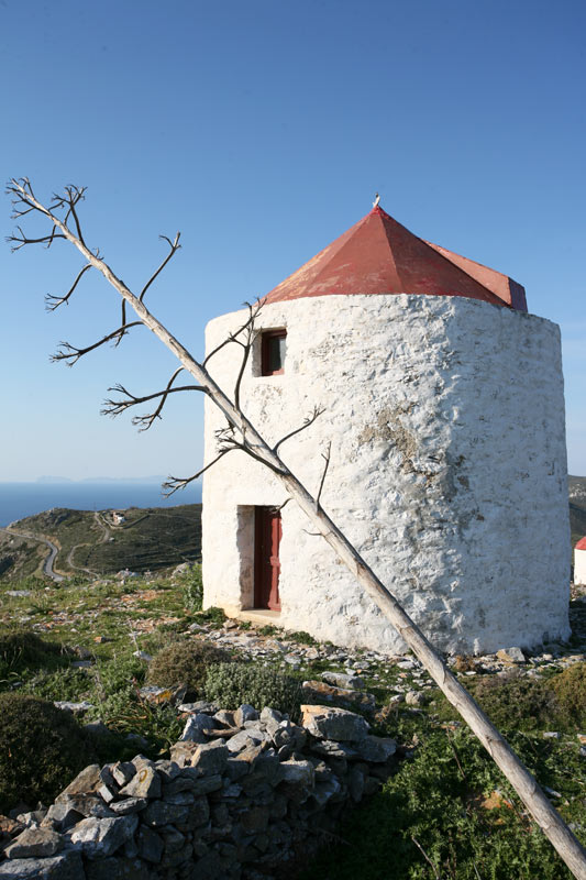 Ένας από τους διατηρημένους ανεμόμυλους στη Χώρα.Είχαμε, θυμάμαι, συναντηθεί και μιλήσει στα Θολάρια με τον αειθαλή Νίκο Θεολογίτη, τον καθηγούμενο της μονής Χοζοβιώτισσας Σπυρίδωνα Δεναξά και τον Βαγγέλη Πρέκα, που έγινε ευρύτερα γνωστός από την μακρόχρονη συμμετοχή του στο τηλεοπτικό παιγνίδι "Deal". Είχαμε περιπλανηθεί, απ' άκρη σ' άκρη,  στο όμορφο νησί, αλλά είχαμε αφήσει κάποιες μικρές εκκρεμότητες τις οποίες αποφασίσαμε να καλύψουμε προσφάτως, εκμεταλλευόμενοι την παροχή δωρεάν εισιτηρίων από την "Blue Star Ferries". Και όχι μόνο γι' αυτό. Θα μπορούσαμε να επιλέξουμε κάποιο άλλο νησί των Κυκλάδων ή της Δωδεκανήσου, αλλά η Αμοργός διαθέτει πολλά από εκείνα τα προσόντα που προσελκύουν επισκέπτες με τις δικές μας "προδιαγραφές".