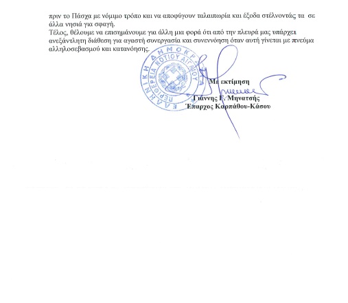 Σαν συνέχεια αυτού του ατυχούς περιστατικού, σε συνδυασμό και με την διαμαρτυρία της κας Δημάρχου Κάσου για την ημερομηνία επίσκεψης του κ. Επάρχου Καρπάθου Κάσου στο νησί, προκειμένου να προχωρήσει η αδειοδότηση λειτουργίας του σφαγείου, ο Έπαρχος Καρπάθου Κάσου κ. Γιάννης Μηνατσής έστειλε σήμερα στον Δήμο Κάσου την ακόλουθη επιστολή.